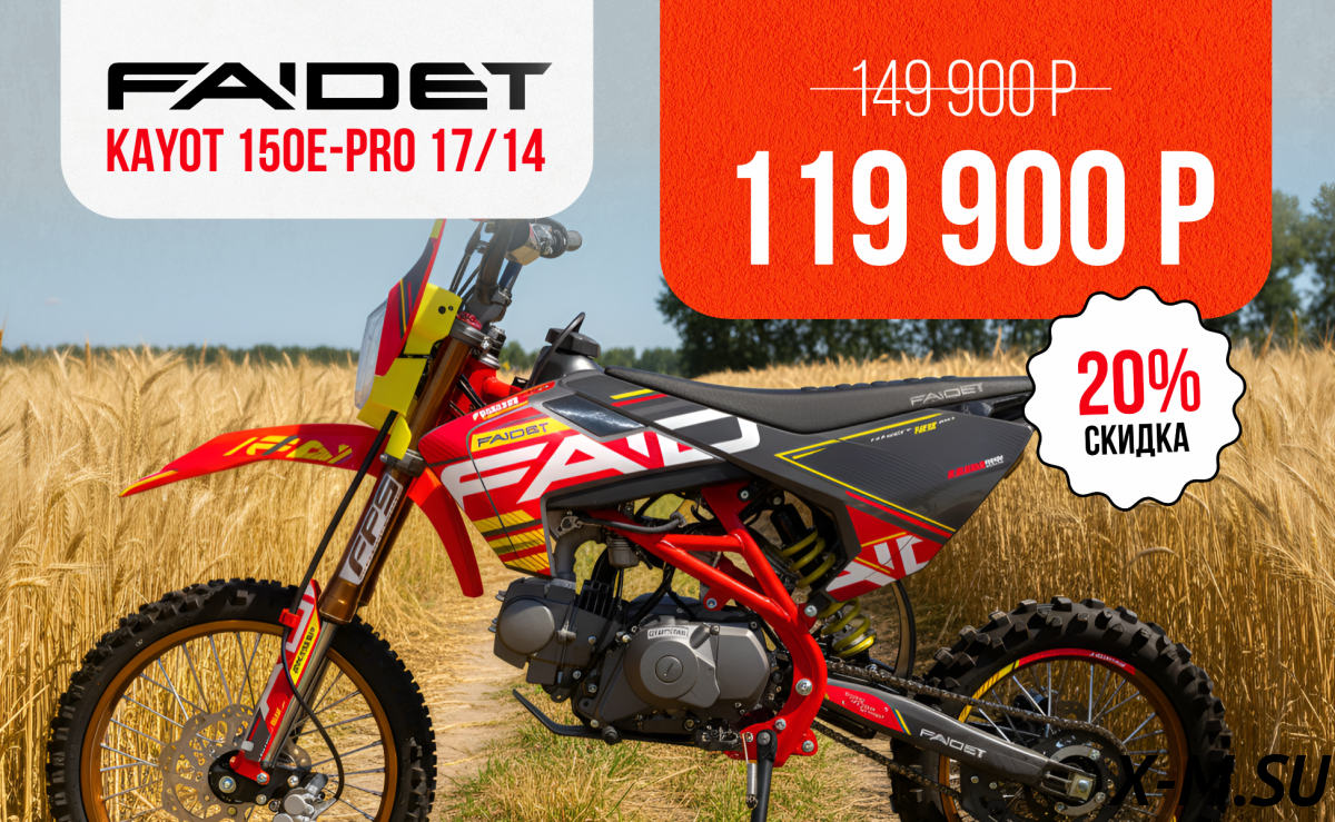 Пацаны, всем привет! Купил себе этот FAIDET, катаюсь уже неделю – восторг полный! Мотор рвет как бешеный, подвеска мягкая, на кочках просто плывёт. Тормоза отличные – чувствуется надежность. Комплектация полная, ничего докупать не пришлось. Даже удивился качеству за такие деньги. В общем, советую всем, кто ищет надежный и быстрый питбайк. Даже на бездорожье прёт!